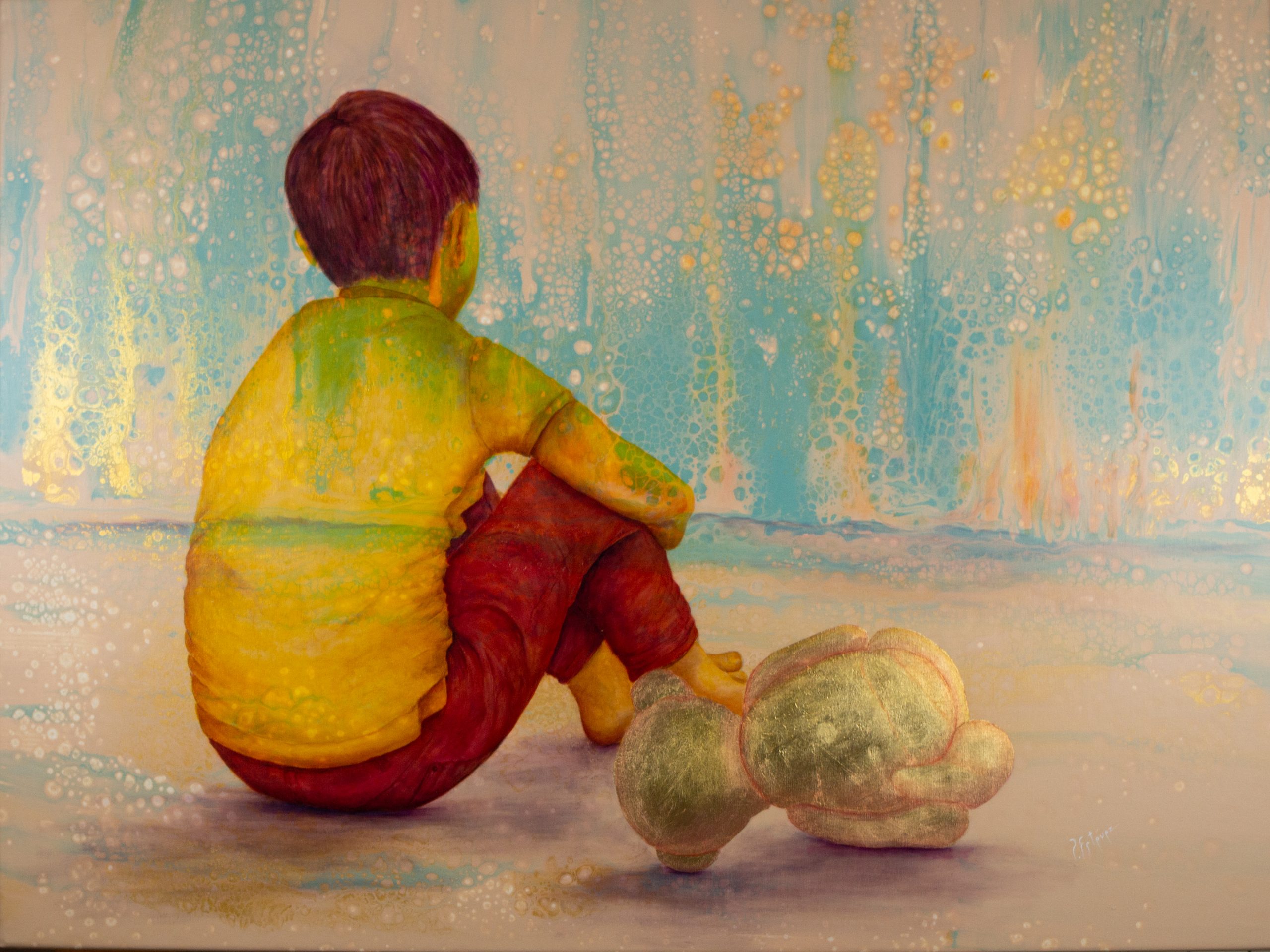 En esta obra rememoro aquellos momentos de mi infancia en que me sentía solo, mi mente creaba lugares y situaciones donde quisiera estar , acompañado de ese peluche que era la conexión con mi pasado y me recordaba el inicio de una nueva etapa que me marcaría para siempre en lo más profundo de mi alma .